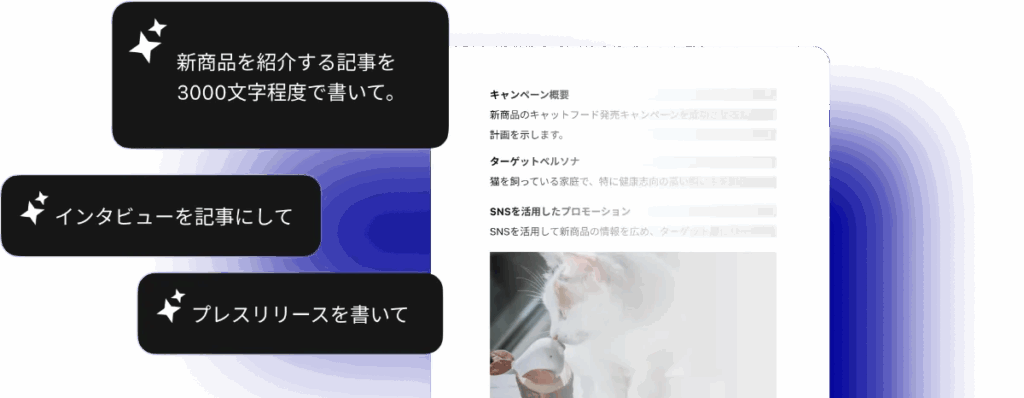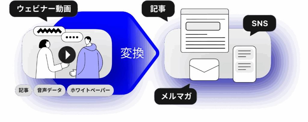 | チャネル展開 | 記事からSNS投稿、ホワイトペーパーからメルマガへの展開など、多様なフォーマット変換を一気通貫で実現します。 |