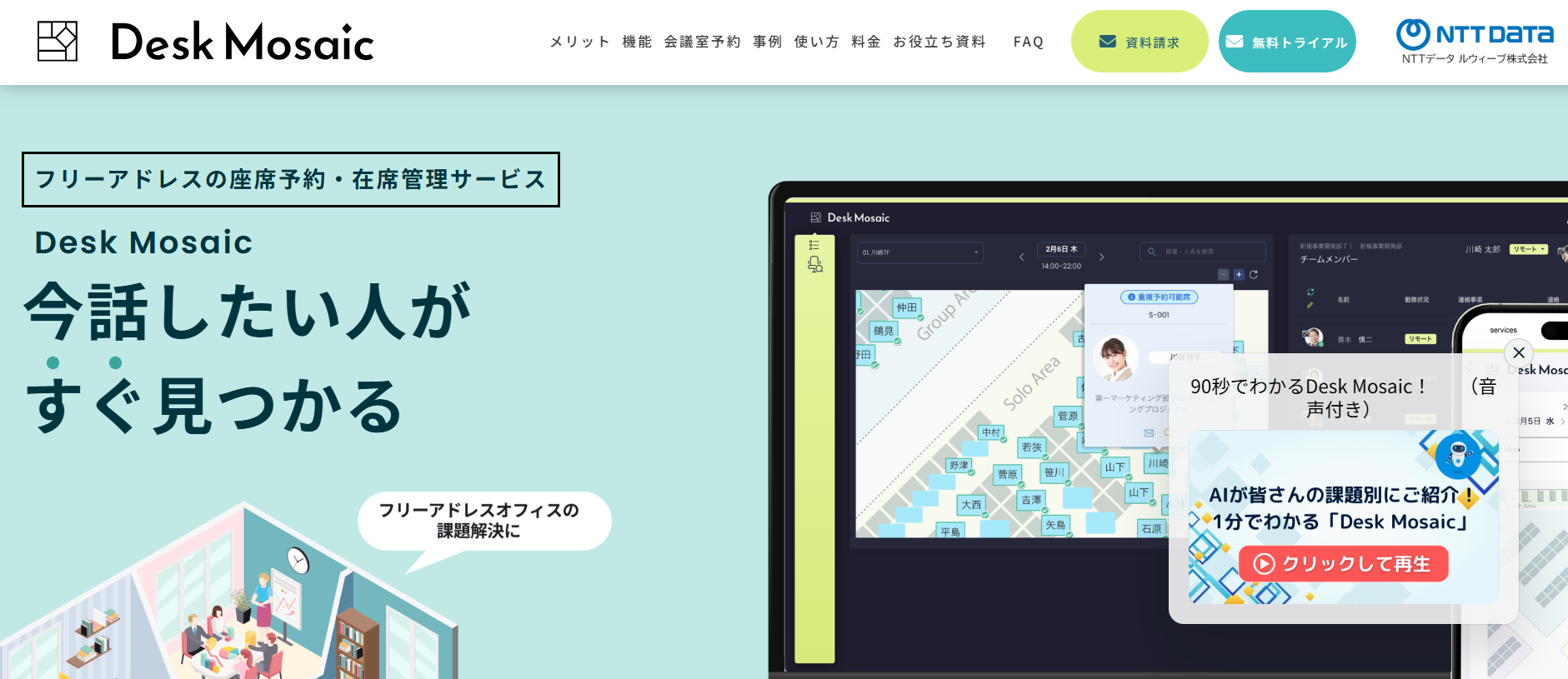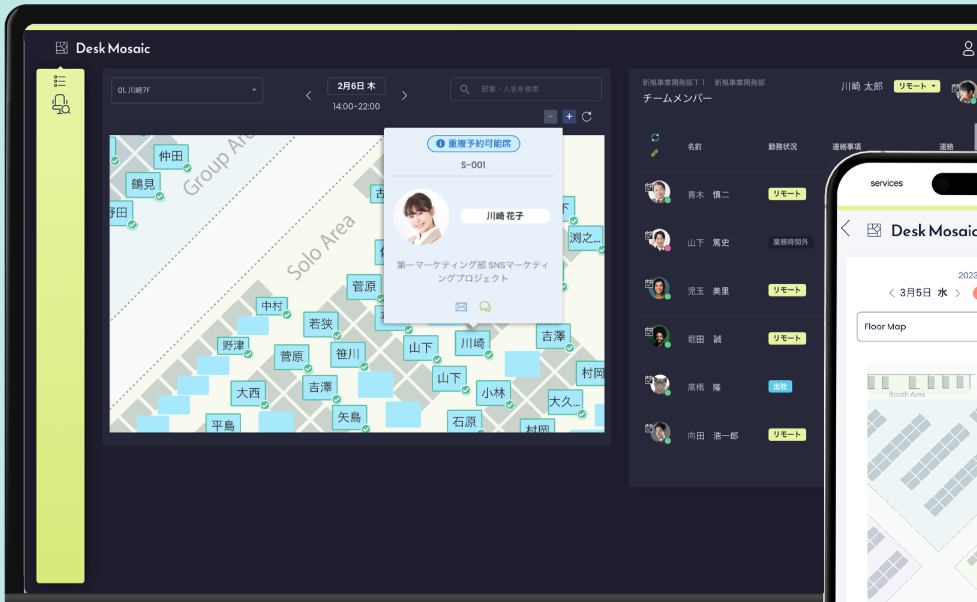 Desk Mosaicは、社員が自由に座席を選べるフリーアドレス環境をスムーズに運用するためのクラウド型座席管理サービスです。