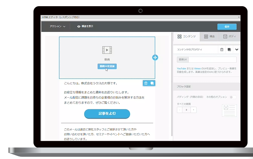 ドラッグ&ドロップによる操作で、HTMLの専門知識がなくてもメールを作成できます。