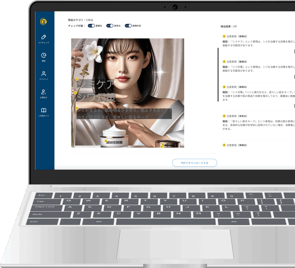 また、化粧品・医薬部外品・健康食品など幅広い商材に対応しており、多様な広告表現に対して一括でチェック可能となっています。