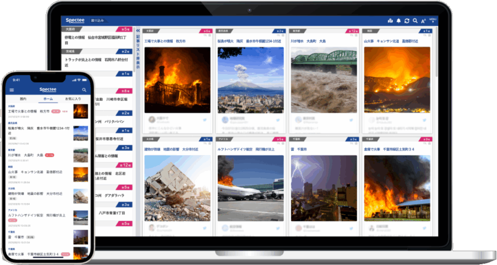 Spectee ProはSNSや映像データなど多様な情報源をAIが解析し、災害や事故に関する重要な情報をリアルタイムで通知するサービスです。